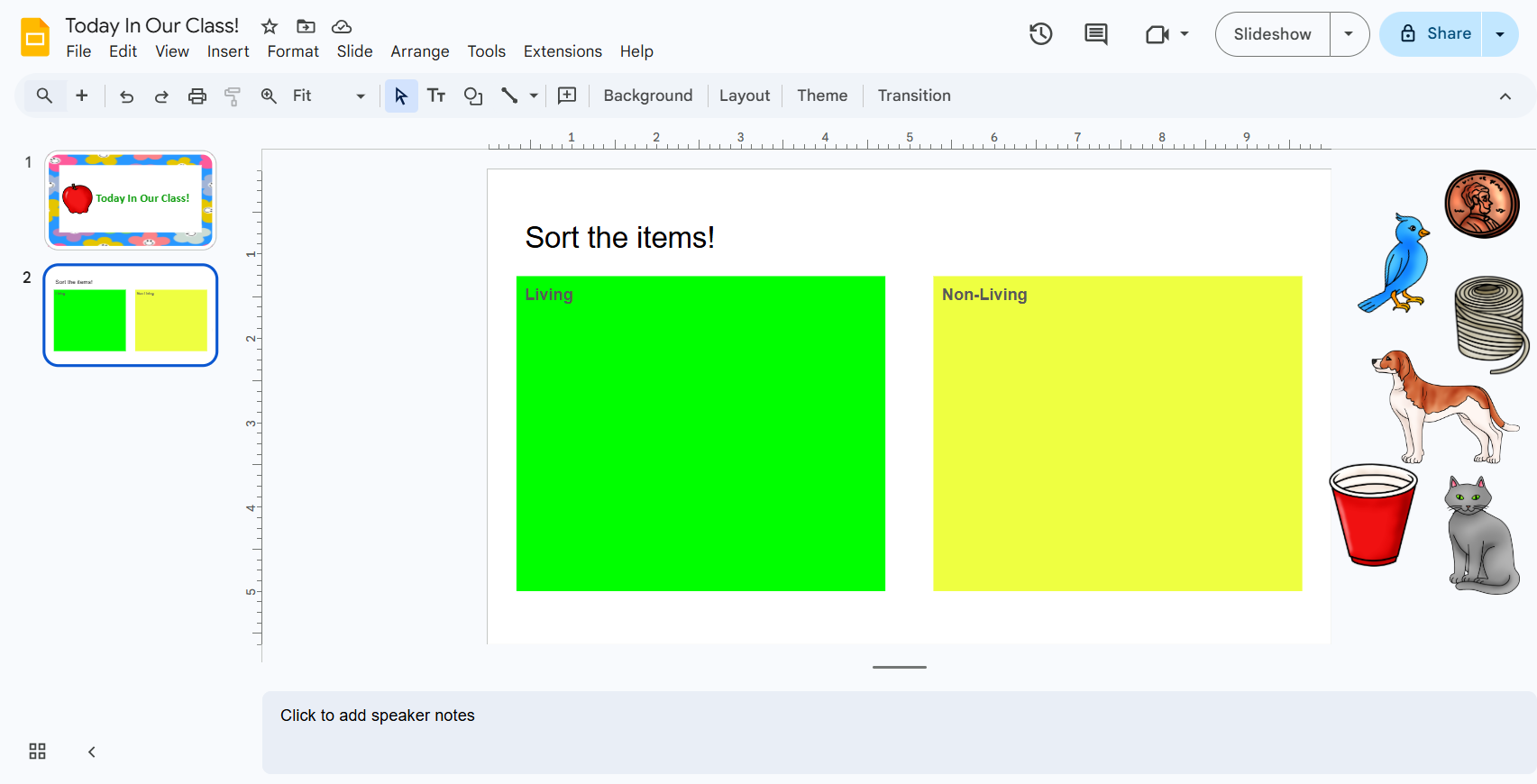 1. Create a slide with two columns labeled “Living” and “Non-Living.”