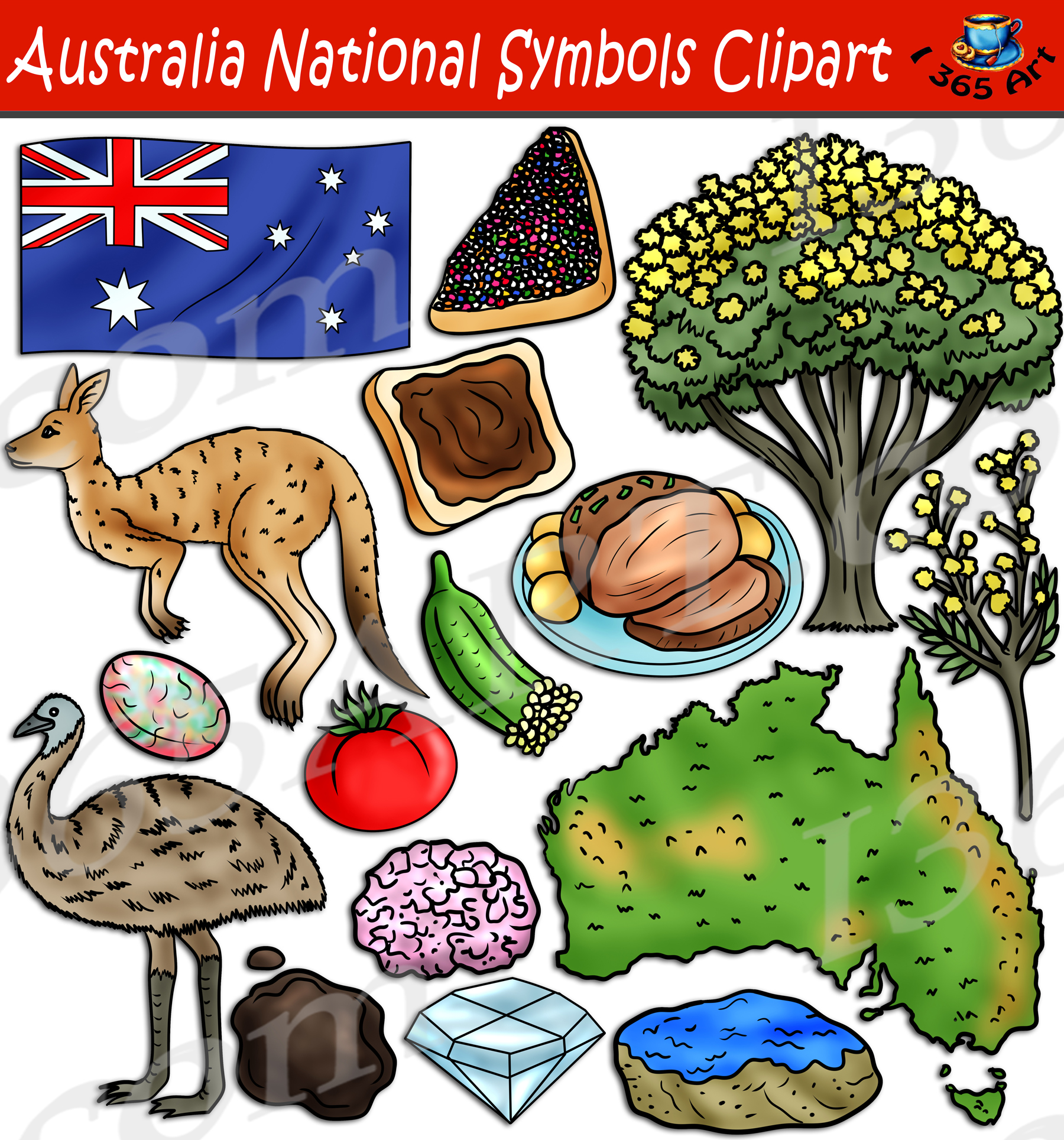 Some of the elements included in this clipart set are the following: Australia (country), Australia flag, bush tomato, cobalt, diamond, emu, fairy bread, finger lime, golden wattle, golden wattle tree, kangaroo, lithium, opal, petroleum, roast lamb and vegemite toast.