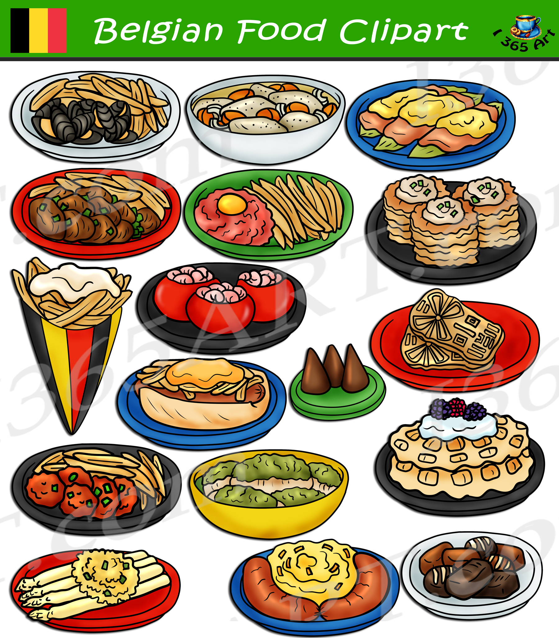 Some of the Foods included in this clipart set are the following: Asparagus a la flamande, Belgian chocolate, boulets liegeois, carbonnade flamande, cuberdon, endives au jambon, filet Americain, frites, mitraillette, moules frites, paling in’t groen, speculoos, stoemp, tomate crevette, vol au vents, waffles and waterzooi.
