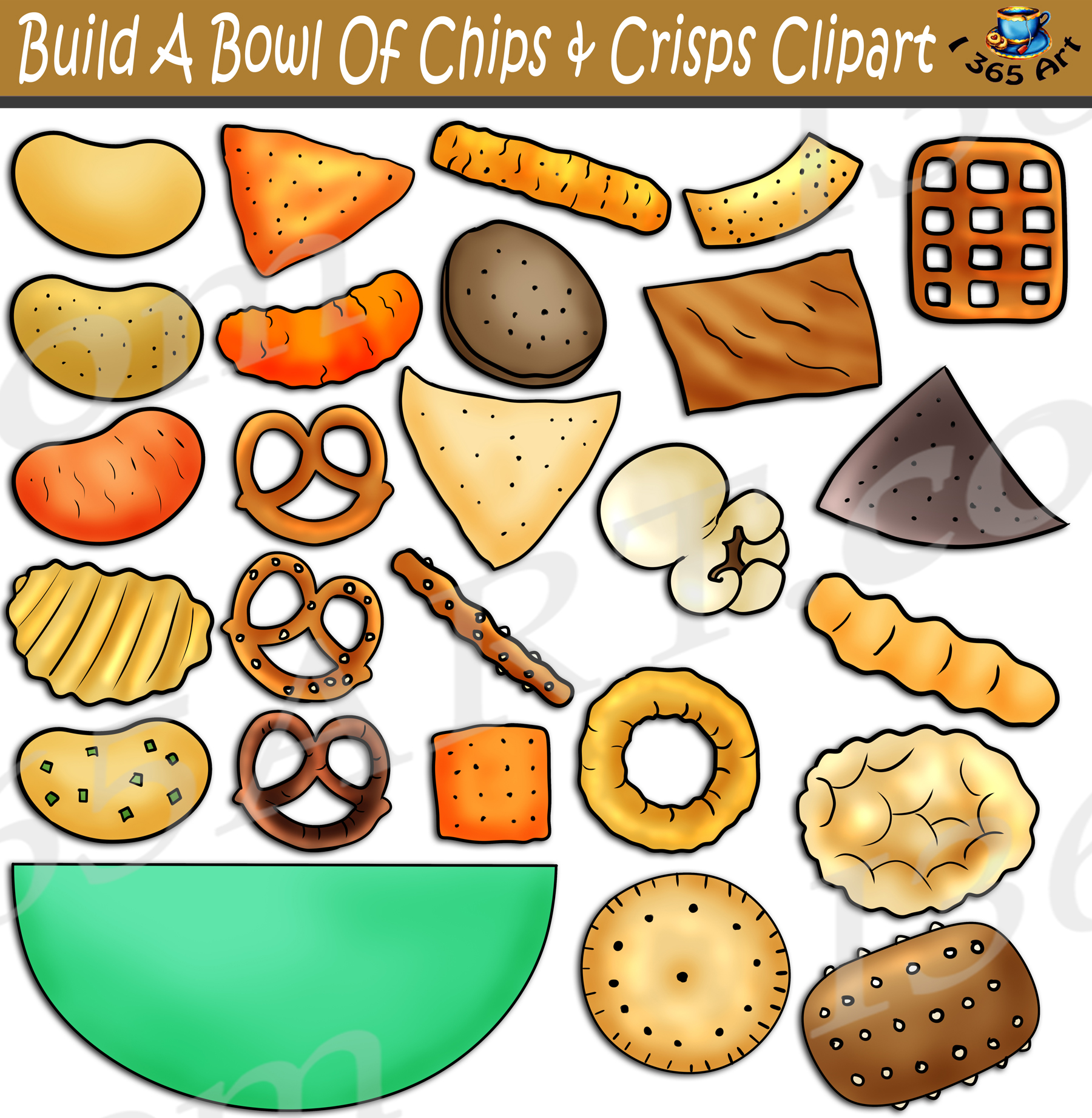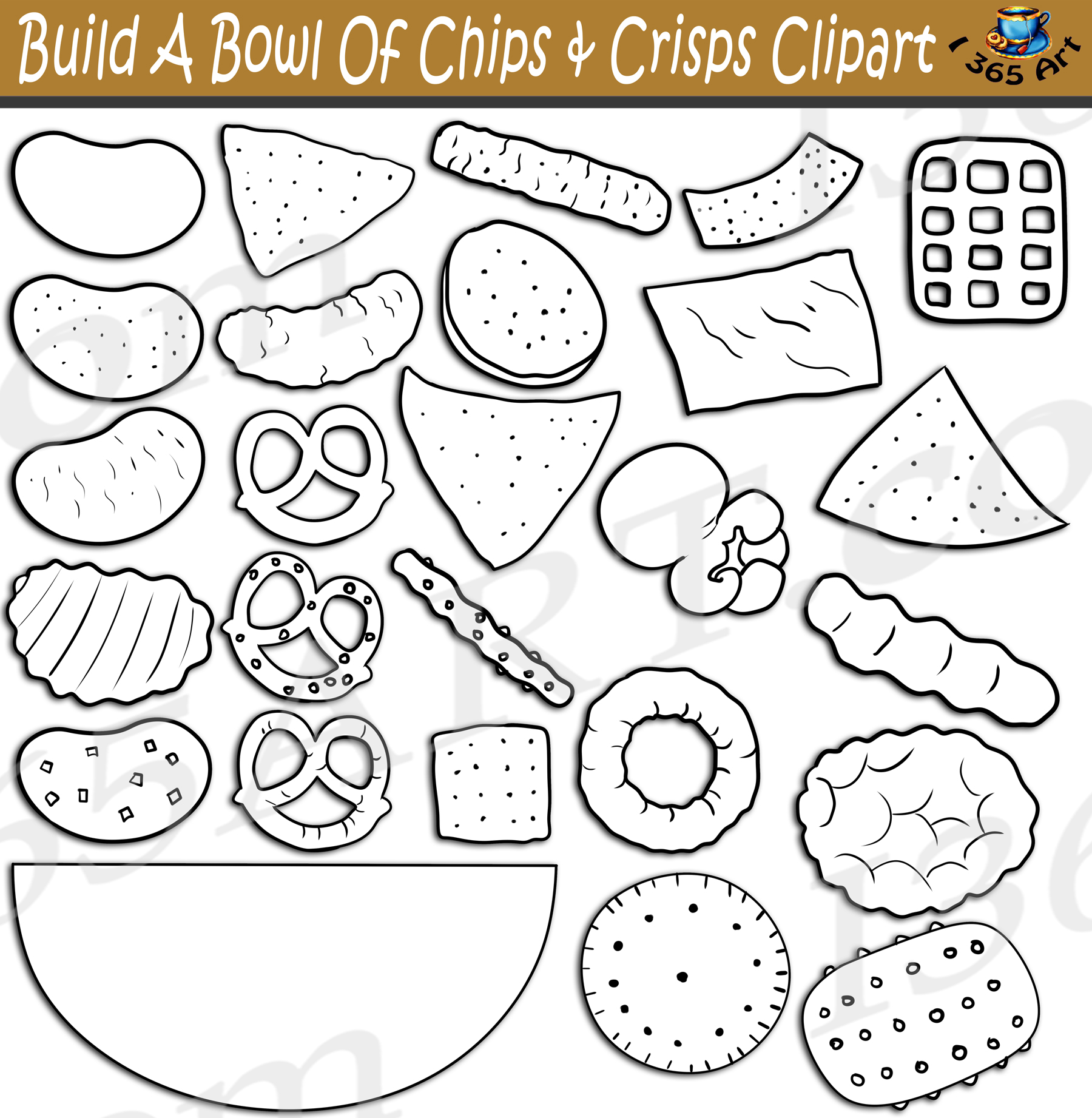 Build A Bowl Of Chips & Crisps Clipart set contains ingredients for building a custom bowl of delicious snacks. Teach your young students about the importance of nutrition through food building using food clipart! Comes with 52 PNG format graphics in both color and black and white. (26 full color and 26 black and white). Each file is 300 DPI Resolution each and have a transparent background in PNG. These files are perfect for use commercially, personally or for school projects and activities.