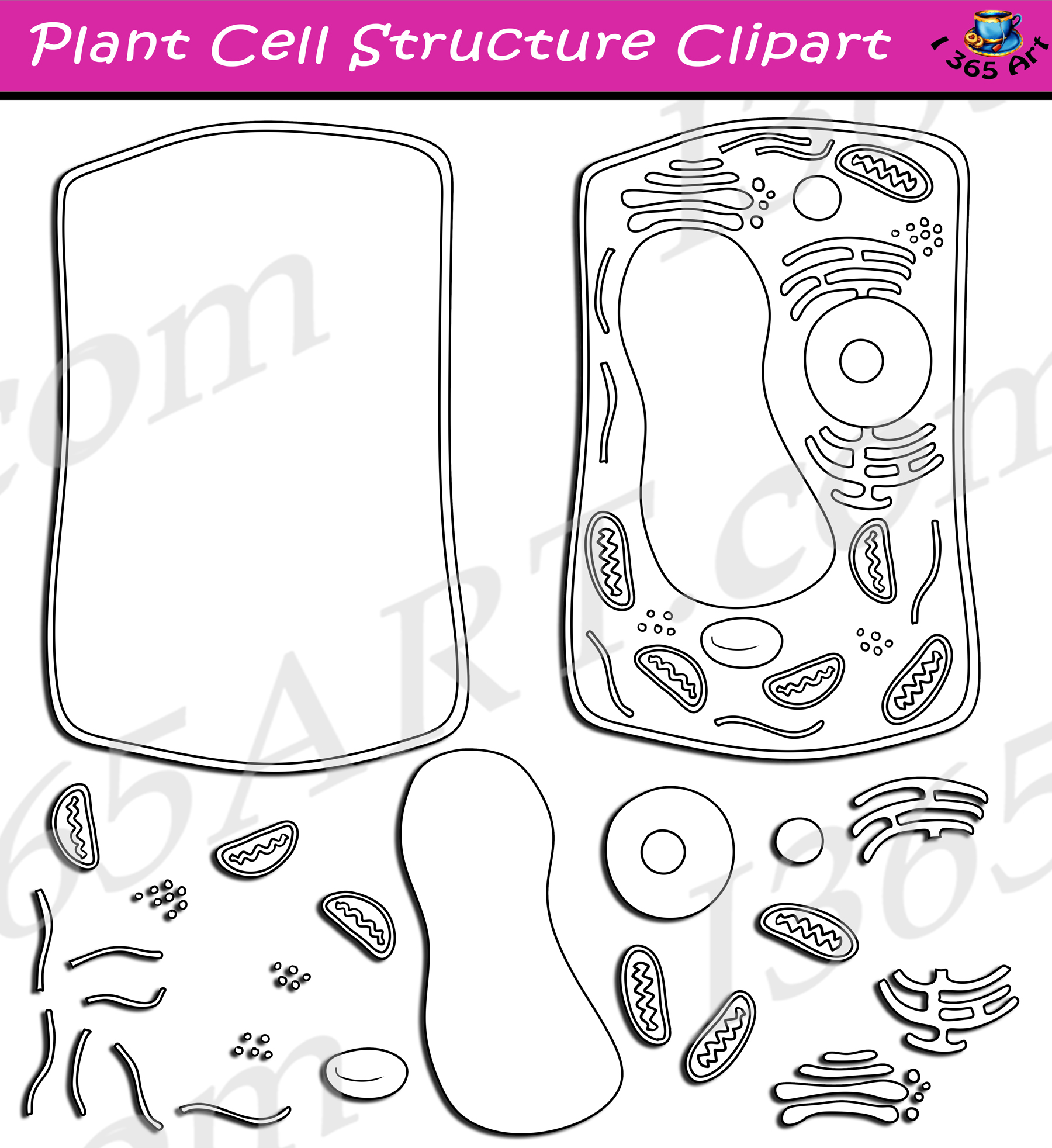 Build A Plant Cell Structure Clipart set contains various types of elements for building a plant cell! This set is perfect for all the science lovers out there! School clipart perfect for use in brochures, story books, science projects, classroom assignments and scrapbooking projects. Comes with 50 PNG format clip art graphics in both color and black and white. (25 full color and 25 black and white). Each file is 300 DPI Resolution size each and have a transparent background in PNG. These files are perfect for use commercially, personally or for school projects and activities.