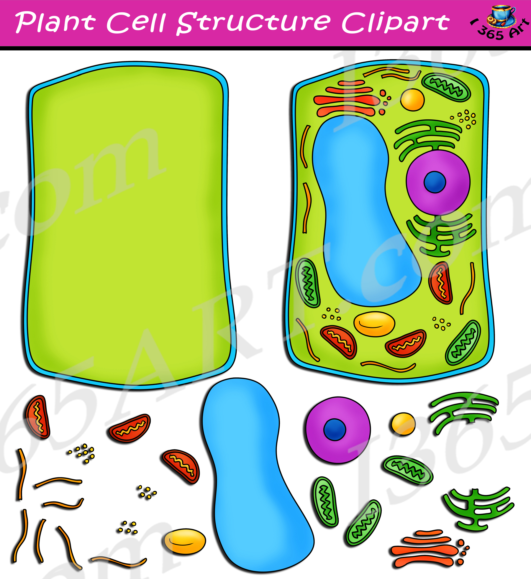 Some elements included in this clipart set are the following: Plant Cell Structure, blank plant cell structure, amyloplast, chloroplasts, endoplasmic reticulum, golgi apparatus, lysosome, mitochondrion, nucleus, plant cell membrane, raphide crystal, ribosomes and vacuole.