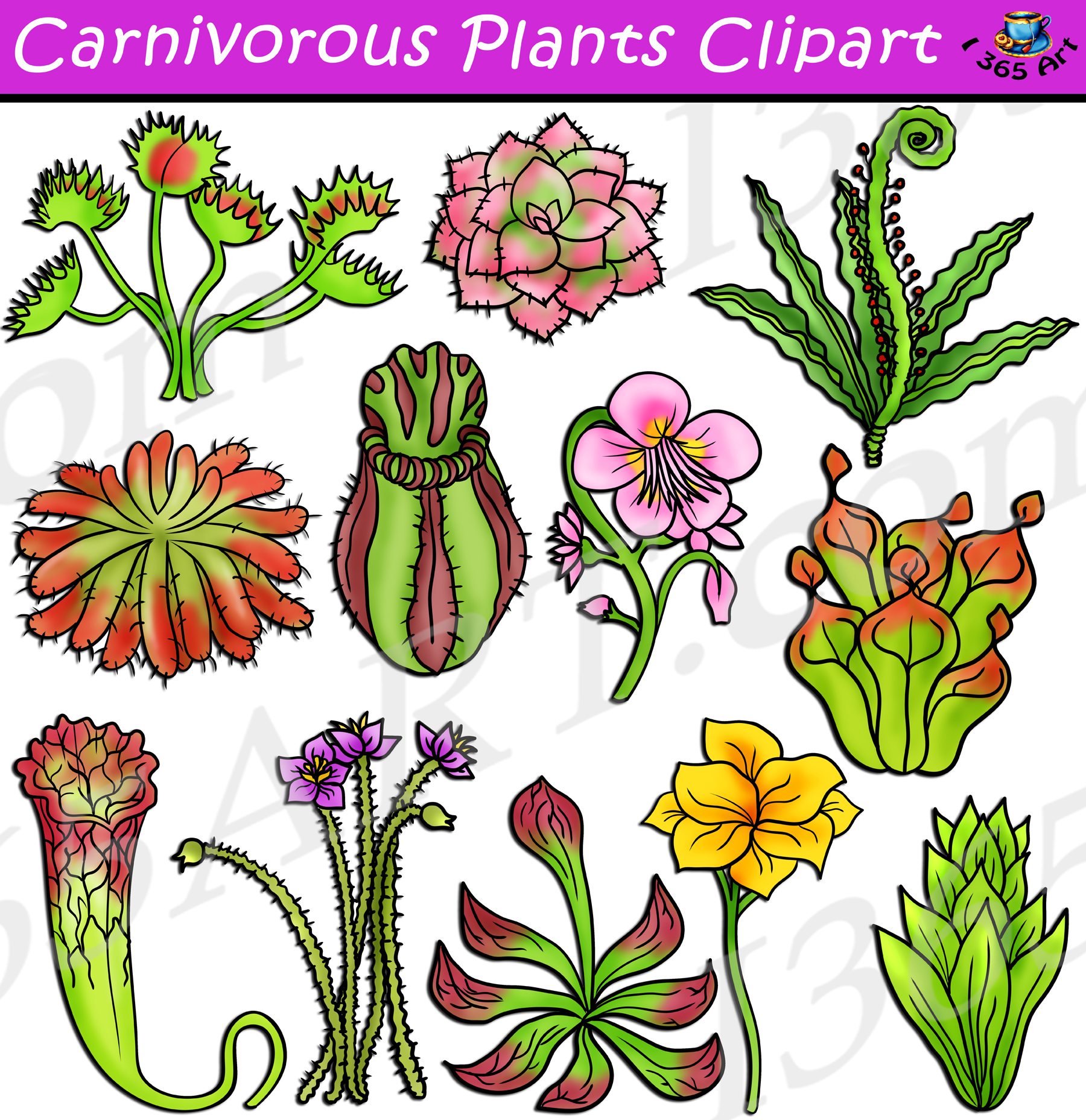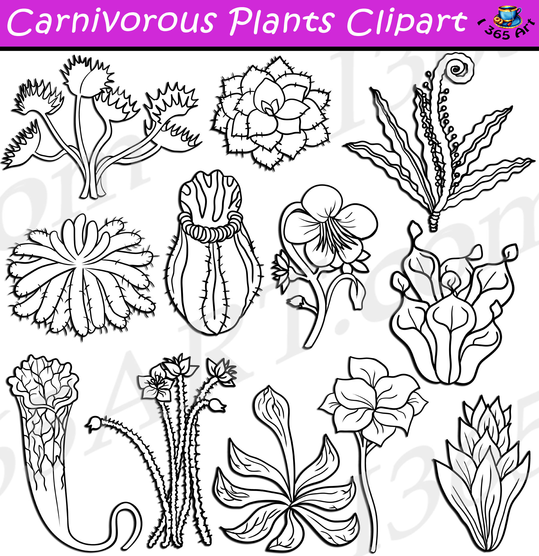 Carnivorous Plants Clipart set contains various types of carnivorous plants from around the world! This set is perfect for those wanting to learn about various types of unique plants! School clipart perfect for use in brochures, story books, restaurant menus, food and cooking projects, classroom assignments and scrapbooking projects. Comes with 22 PNG format clip art graphics in both color and black and white. (11 full color and 11 black and white). Each file is 300 DPI Resolution size each and have a transparent background in PNG. These files are perfect for use commercially, personally or for school projects and activities.