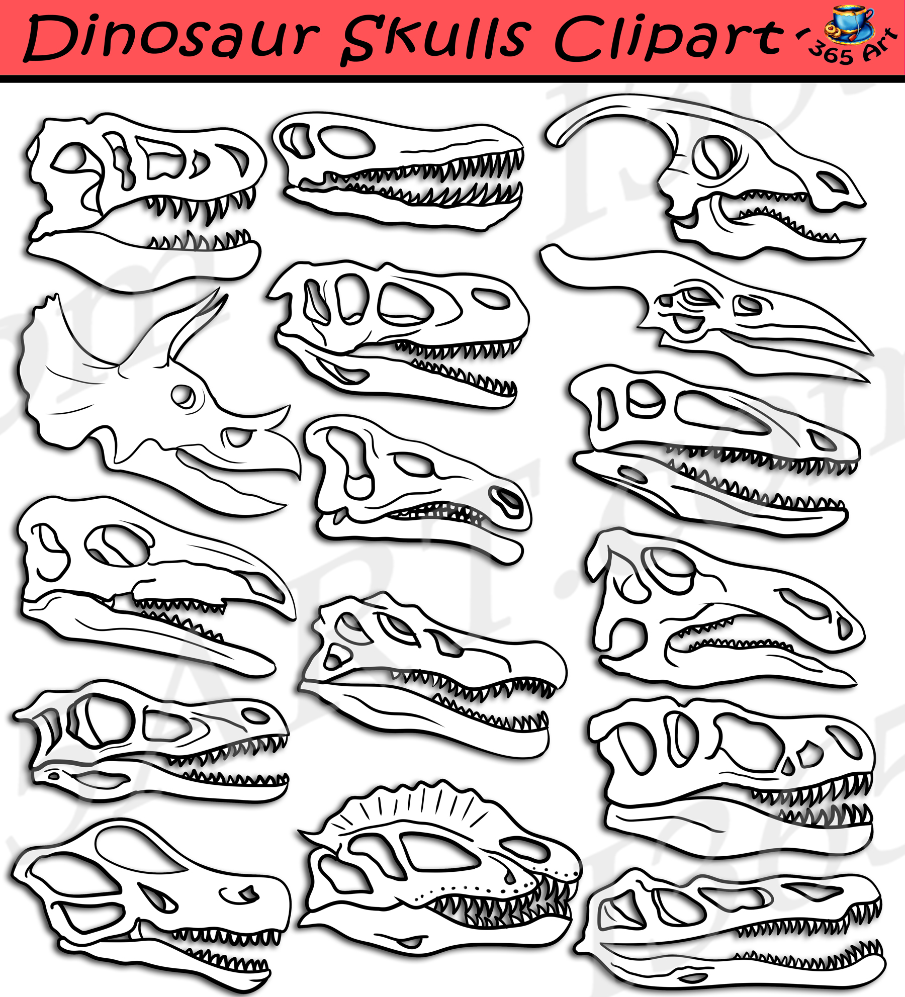 Dinosaur Skulls Clipart set contains various types of dinosaur skulls and fossils graphics! This set is perfect for those wanting to learn about various types of dinosaurs that inhabited the Earth! School clipart perfect for use in brochures, story books, restaurant menus, food and cooking projects, classroom assignments and scrapbooking projects. Comes with 32 PNG format clip art graphics in both color and black and white. (18 full color and 16 black and white). Each file is 300 DPI Resolution size each and have a transparent background in PNG. These files are perfect for use commercially, personally or for school projects and activities.