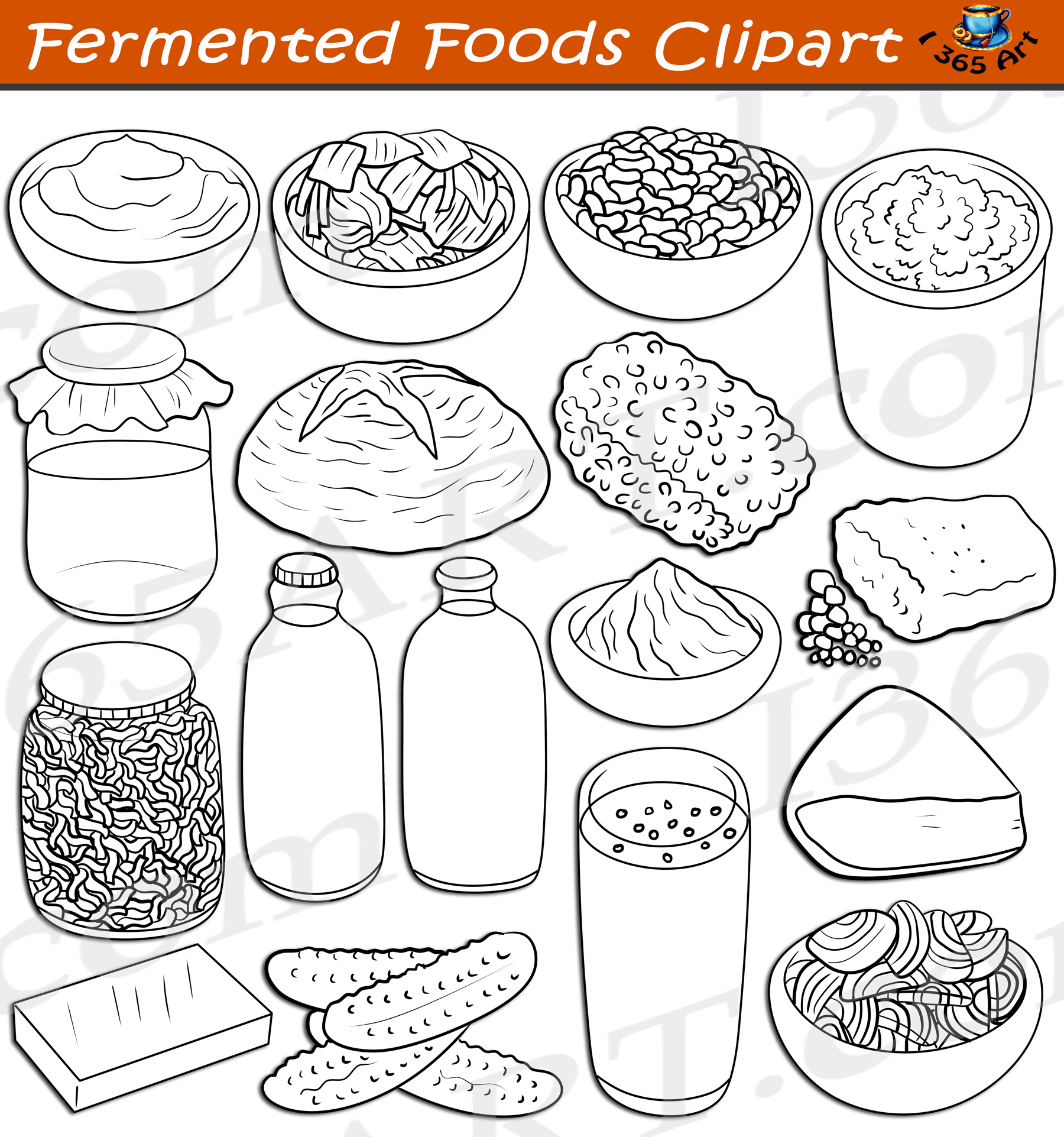 Some of the images included in this clipart set are the following: Apple cider vinegar, cheddar cheese, cottage cheese, fermented beets, feta, gouda, kefir, kimchi, kombucha, lassi, miso, natto, pickles, sauerkraut, sourdough bread, tempeh and yogurt.