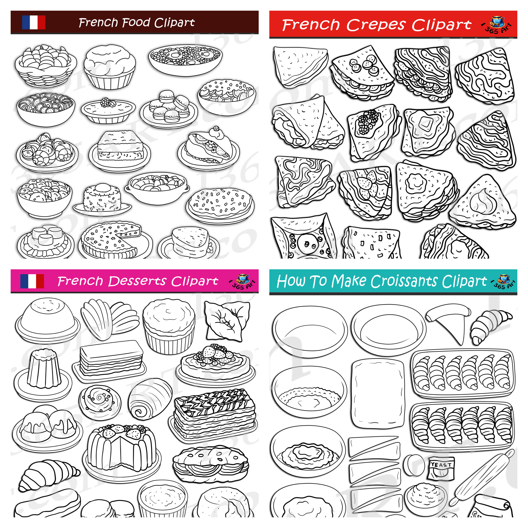French Food Clipart Bundle set contains 138 graphics and features 4 related clip art sets. This set is perfect for students cooking and baking activities! School clipart perfect for use in brochures, story books, restaurant menus, food and cooking projects, classroom assignments and scrapbooking projects. Comes with 138 PNG format clip art graphics in both color and black and white.  Each file is 300 DPI Resolution size each and have a transparent background in PNG. These files are perfect for use commercially, personally or for school projects and activities.