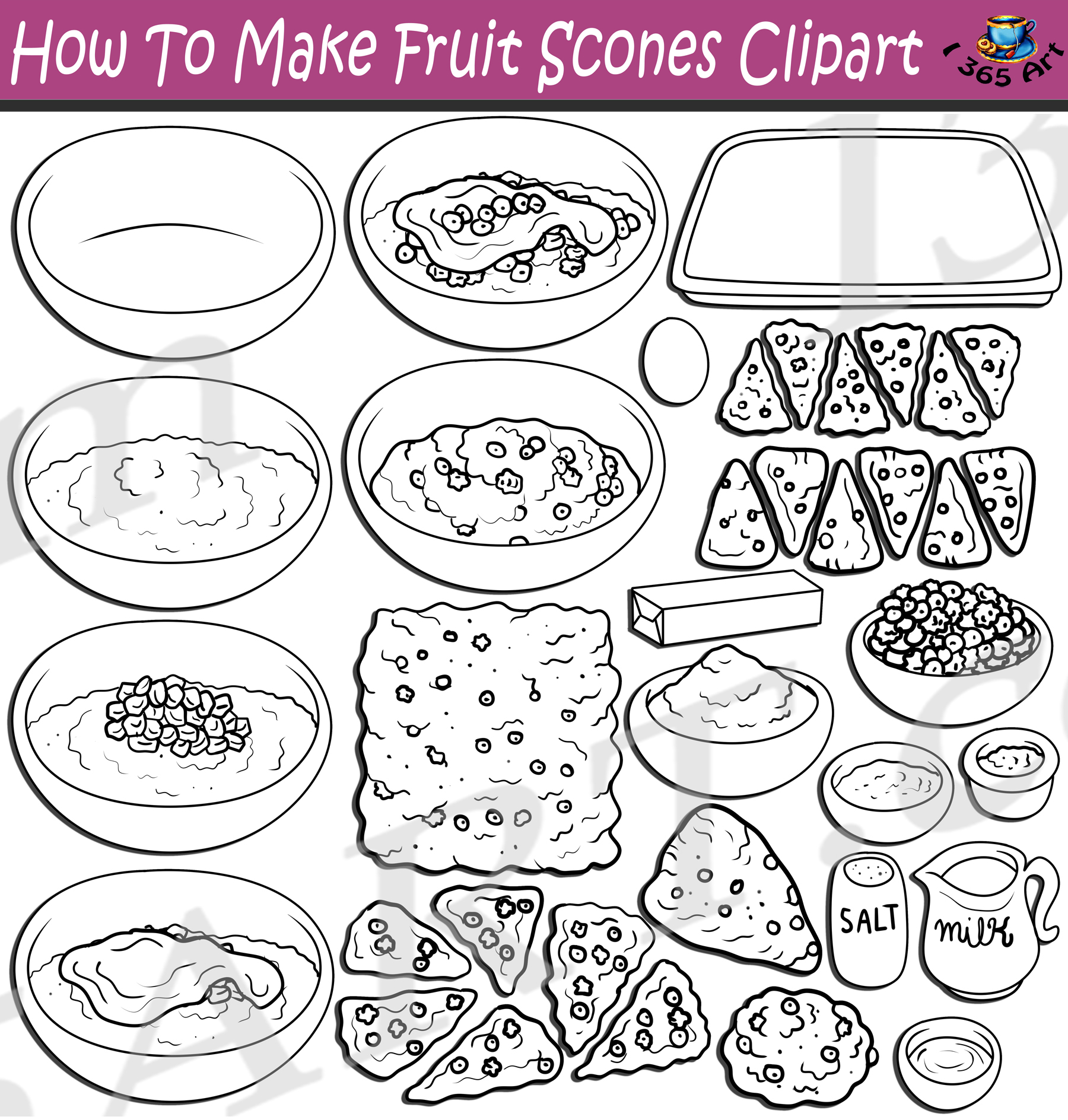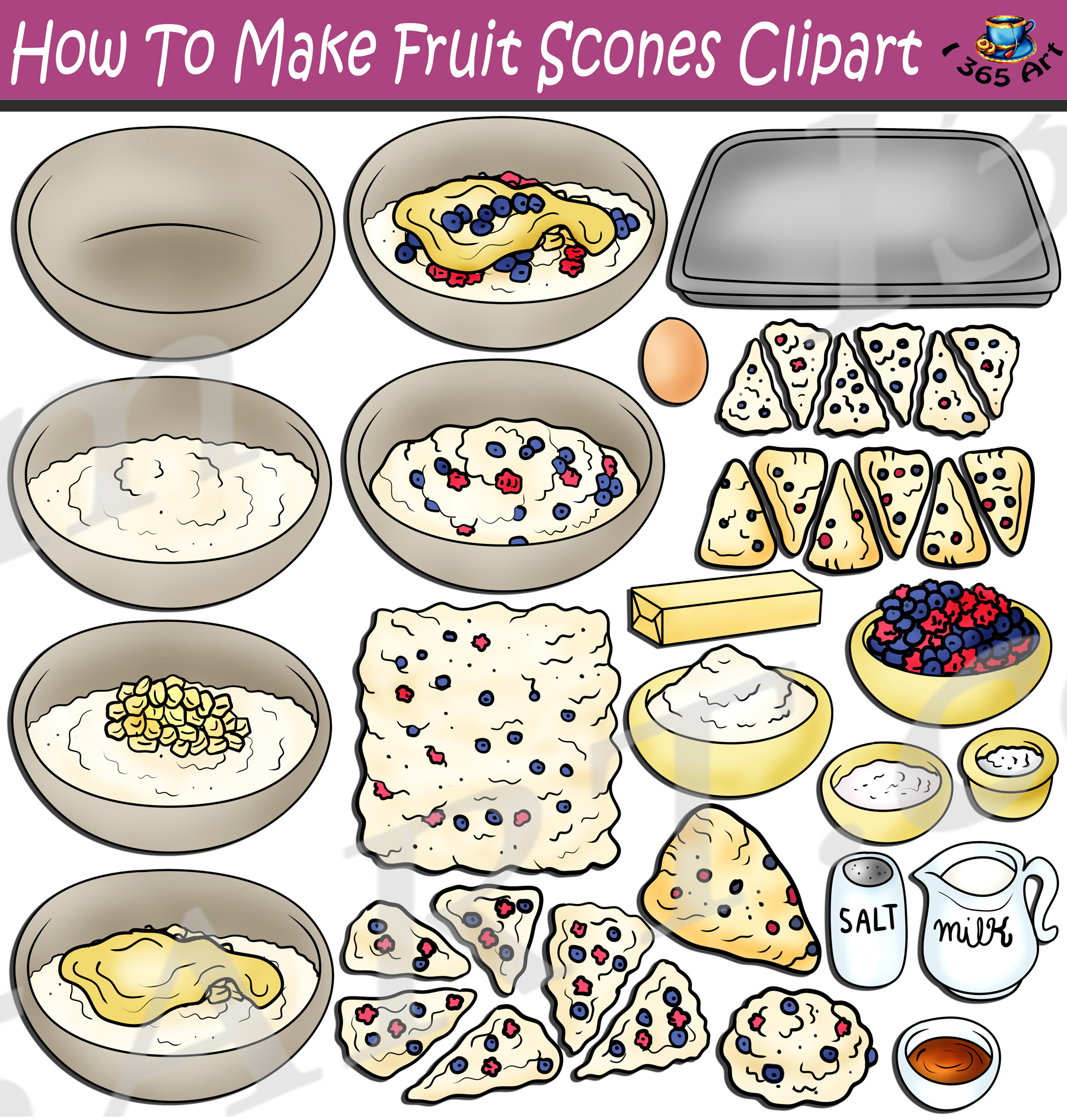Some of the ingredients included in this clipart set are the following: Baking powder, baking sheet, bowl of berries, butter, egg, flour, 9 fruit scones step images, milk, mixing bowl, dough for scones, salt, sugar and vanilla extract.