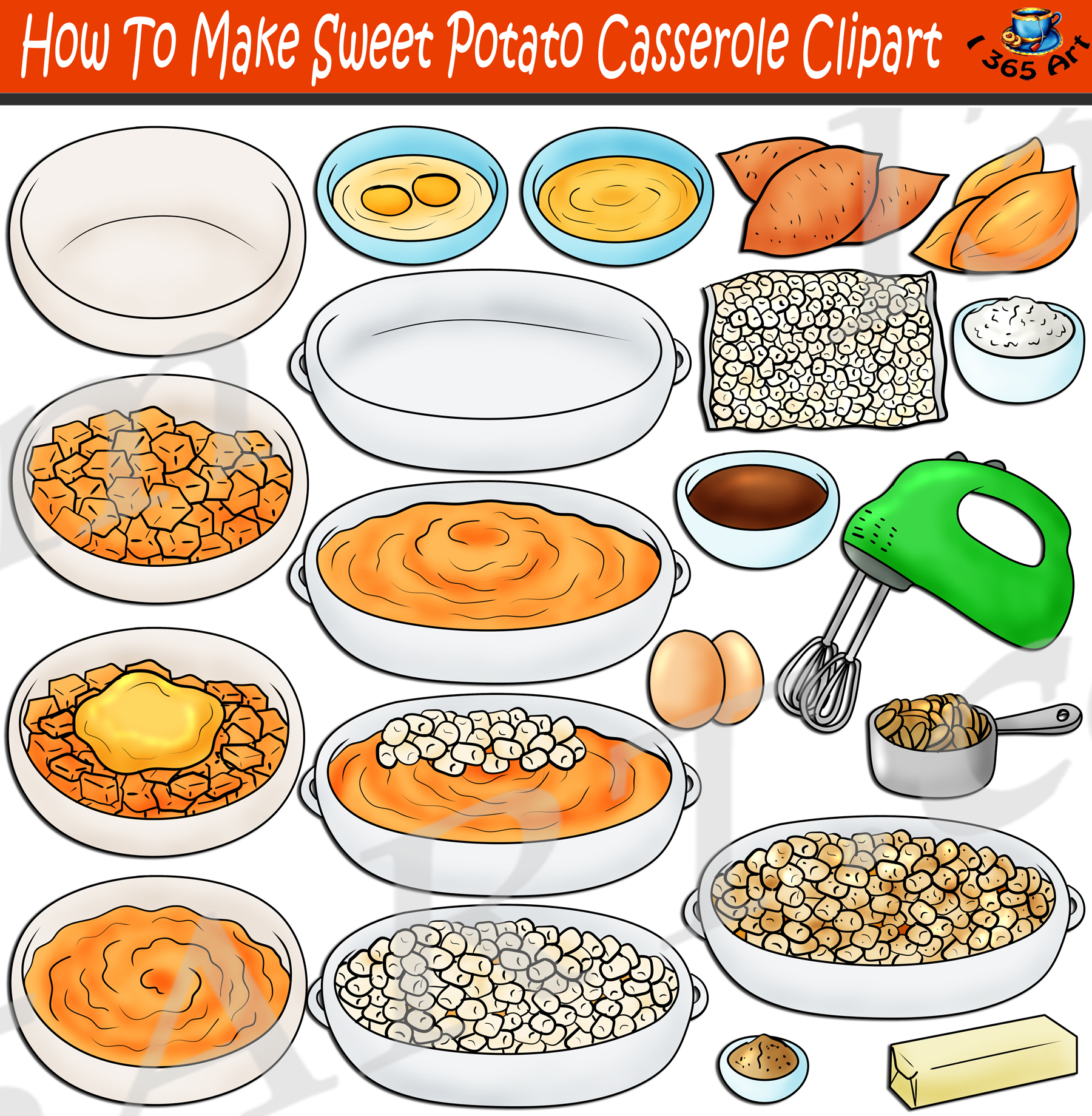 How To Make Sweet Potato Casserole Clipart set contains various ingredients for making this delicious food. This set is perfect for educating your students in an entertaining way! School clipart perfect for use in brochures, story books, restaurant menus, food and cooking projects, classroom assignments and scrapbooking projects. Comes with 42 PNG format clip art graphics in both color and black and white. (21 full color and 21 black and white). Each file is 300 DPI Resolution size each and have a transparent background in PNG. These files are perfect for use commercially, personally or for school projects and activities.