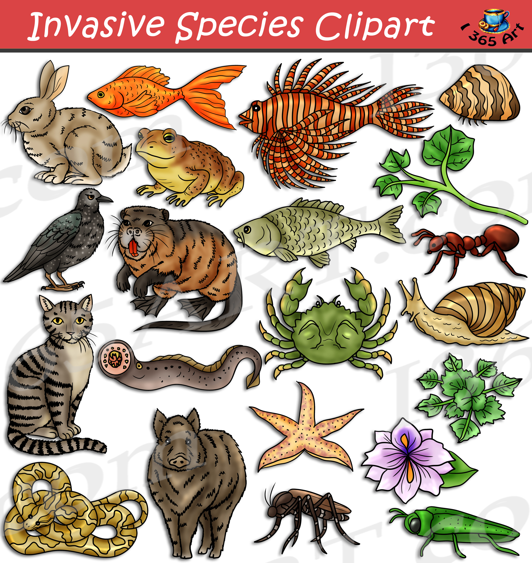 Some of the images included in this clipart set are the following: Asian tiger mosquito, Burmese python, cane toad, carp, common ivy, domestic cat, emerald ash borer, European green crab, European rabbit, feral hog, giant African snail, goldfish, lionfish, Northern Pacific sea star, nutria, red imported ant, sea lamprey, starling, water chestnut, water hyacinth and zebra mussel.