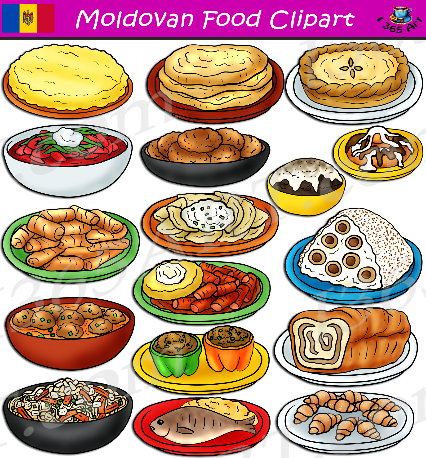 Some of the Foods included in this clipart set are the following: bors moldovan, coltunasi cu branza, cornulete, conzonac, cusma lui guguta, fried fish, kofta, mamaliga traditionala, papanasi, parjoale, paska, placinte, prunce uscata cunuci, sarmale, stuffed bell peppers, tochitura and zema.