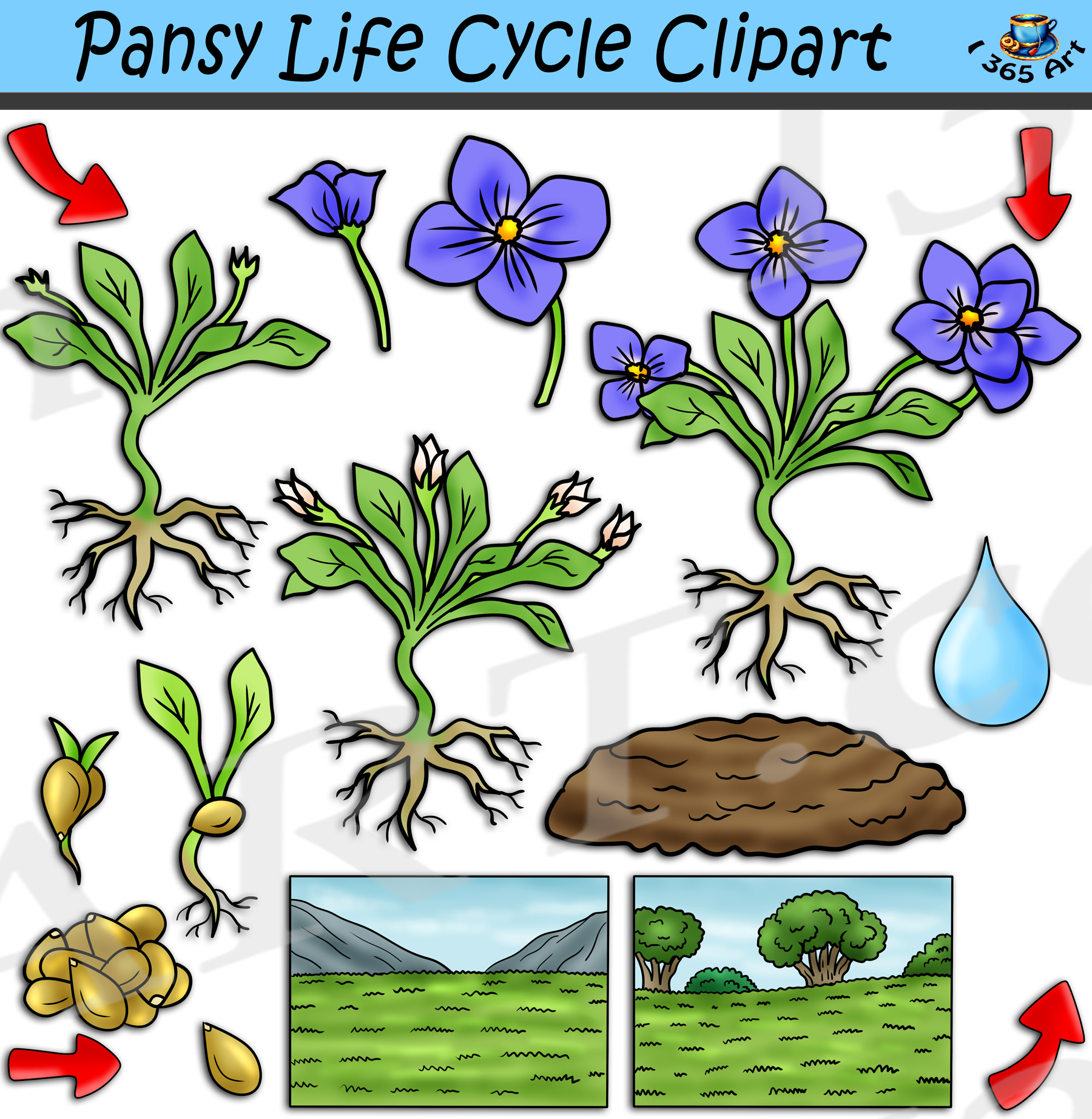 Pansy Flower Life Cycle Clipart Set is great for teaching your students about the cycle of a flower. This set is perfect for young children wanting to learn more about nature from around the world. Included in the set are 34 PNG format graphics in both color and black and white. (17 full color and 17 black and white). Each file is 300 DPI Resolution each and have a transparent background in PNG. These files are perfect for commercial and personal use. This set includes all of the following. 2 pansy flowers, 5 growth stage images, pansy seeds, pansy seed (individual), soil, water, 2 habitat backgrounds and 4 red arrows.