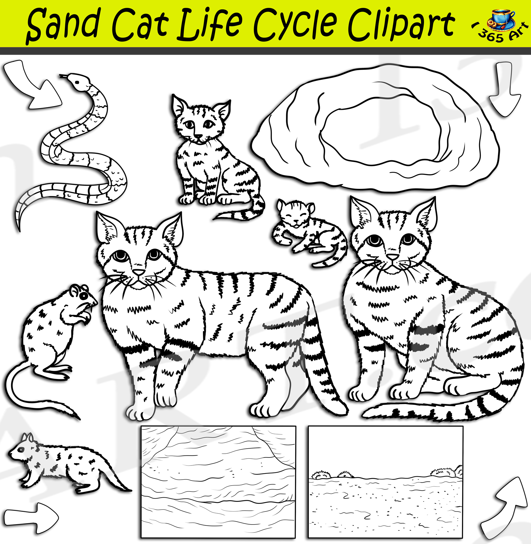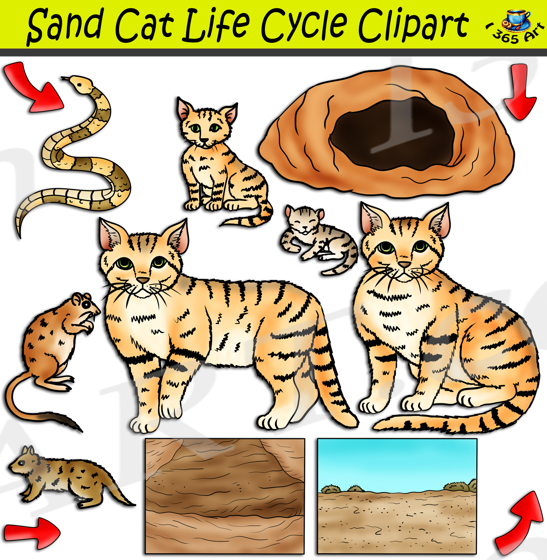 Sand Cat Life Cycle Clipart set is great for teaching your students about the life of a sand cat! This set is perfect for young children wanting to learn more about animals from around the world. Included in the set are 28 PNG format graphics in both color and black and white. (14 full color and 14 black and white). Each file is 300 DPI Resolution each and have a transparent background in PNG. These files are perfect for commercial and personal use. This set includes all of the following. 3 food types (kangaroo rat, rodent and snake), sand burrow, 2 adult sand cats, sand cat juvenile, sand cat newborn, 2 habitat backgrounds and 4 red arrows.