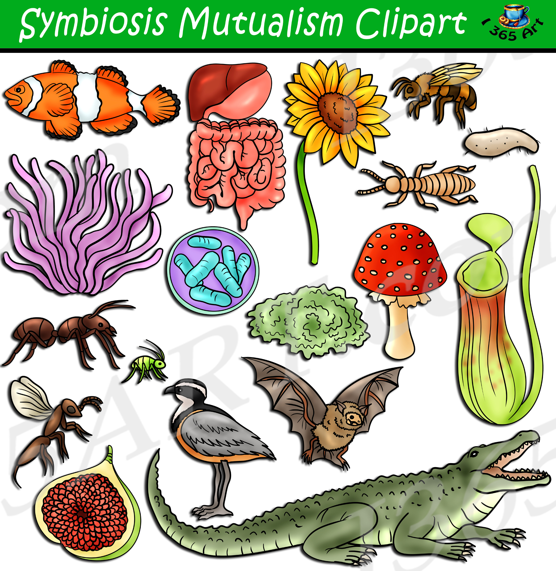 Some of the objects included in this clipart set are the following: Ant, aphid, clownfish, crocodile, Egyptian plover, fig, fig wasp, flower, fungi, gut bacteria, honey bee, human digestive system, lichen, pitcher plant, protozoa, sea anemone, termite and woolly bat.